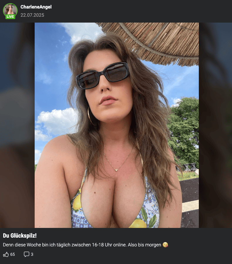 Wer Bock hat auf ehrliche Erotik, Dirty Talk und intime NĂ€he, ist bei Charlene genau richtig. Sie beschreibt sich selbst als lustig, positiv und extrem energetisch â und genau das spĂŒrt man in ihren Liveshows. đŠ
