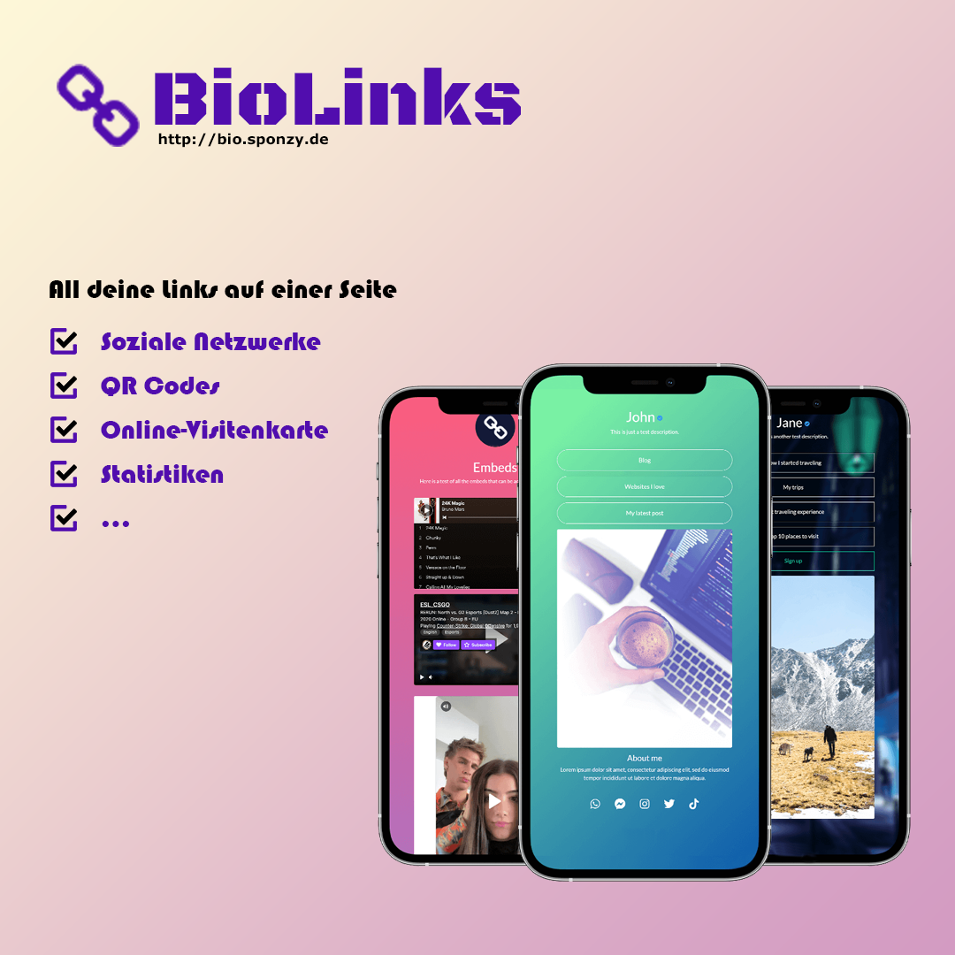 BioLinks - Deine kostenlose persönliche Seite für Fotos, Links zu den Sozialen Netzwerken, Links und Buttons zu anderen Seiten. Zusätzlich sind viele weitere Funktionen verfügbar. http://bio.sponzy.de