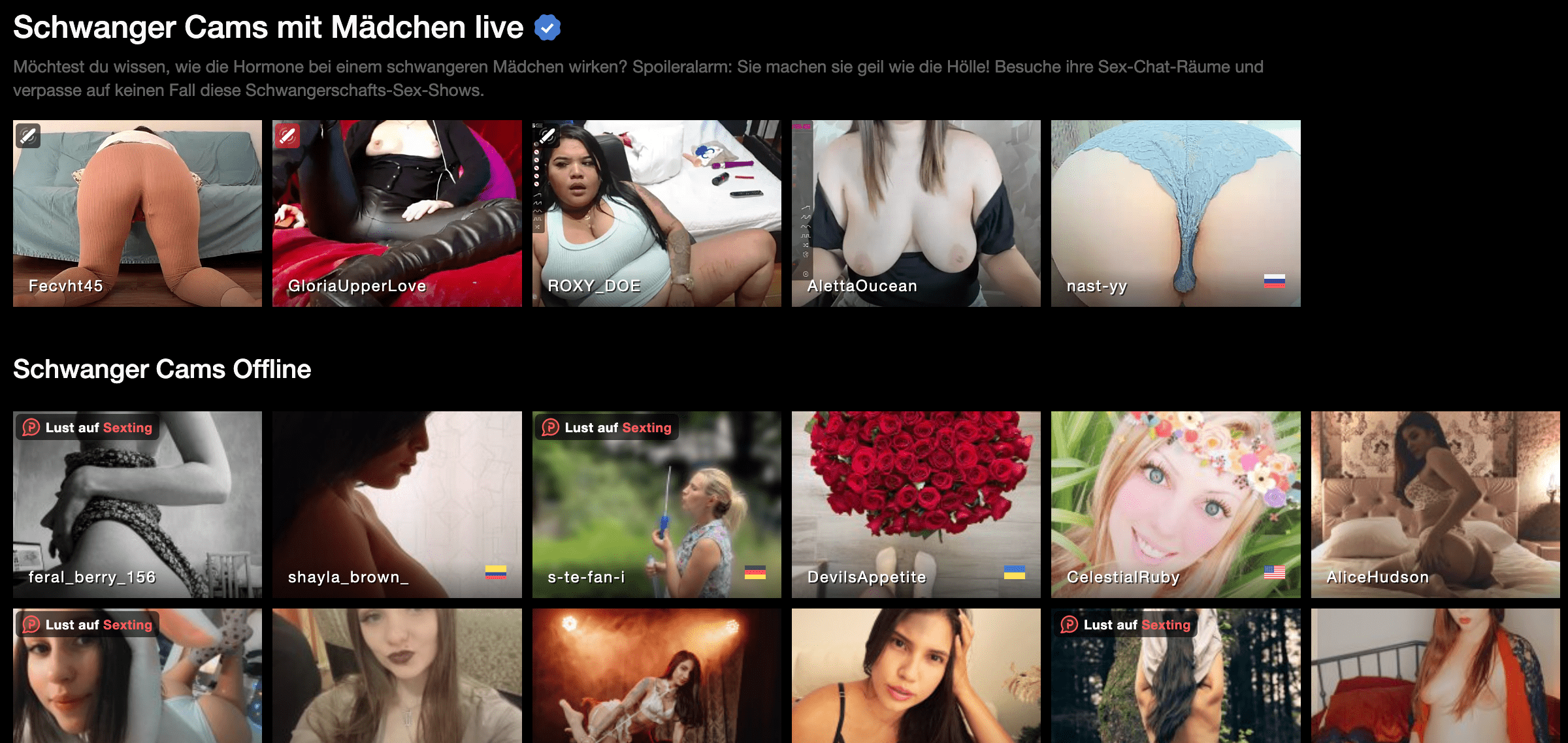 Bei Stripchat in der Kategorie: Schwangere Frauen kann man sich kostenlos schwangere Livestreams ansehen, hier ficken sich die Ladies mit Sextoys jeglicher Art. Es sind auch Paare unterwegs, die es geil finden. Wer will kann sich die Sexshows unverbindlich ansehen.