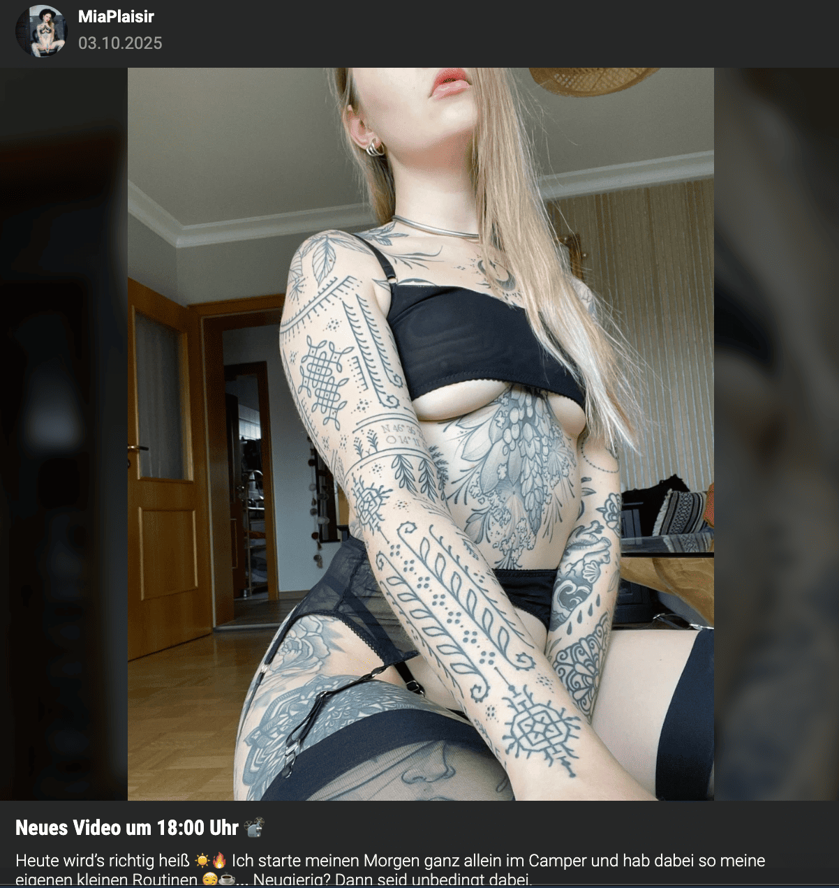 MiaPlaisir, junges Camgirl mit ausdrucksstarken Tattoos, posiert selbstbewusst in schwarzer Lingerie – verführerischer Look.