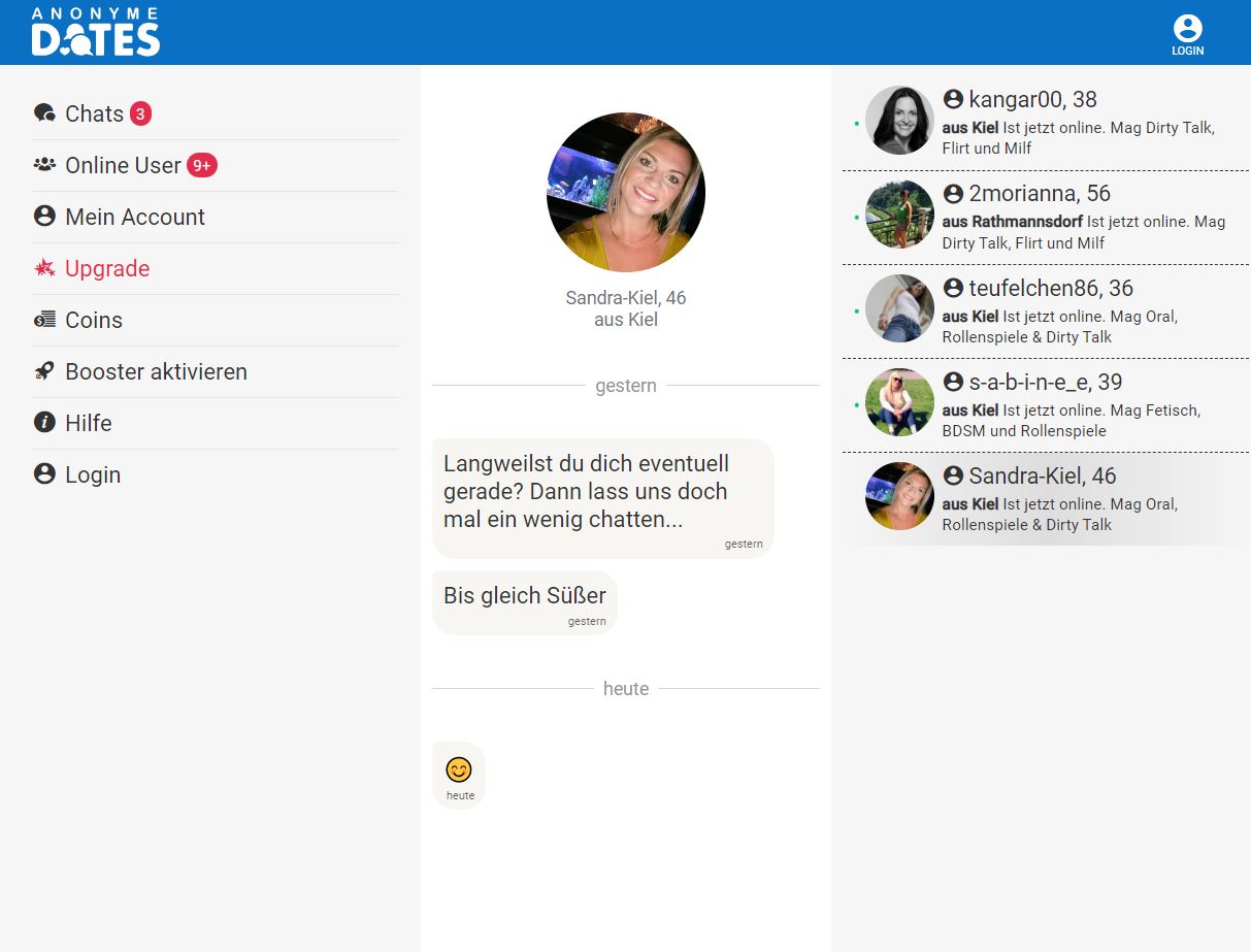AnonymeDates.com eignet sich ebenfalls super für Sex Chats. Wer gerne Anonym unterwegs ist, wird hier sehr viel Freude haben. Wie bei Sexpartnertreff.com suchen hier die meisten User nach einem Sexdate. Der Sex Chat wird für angehende Treffen genutzt. Wer mag kann Geschenke, an seinen Schwarm schicken.