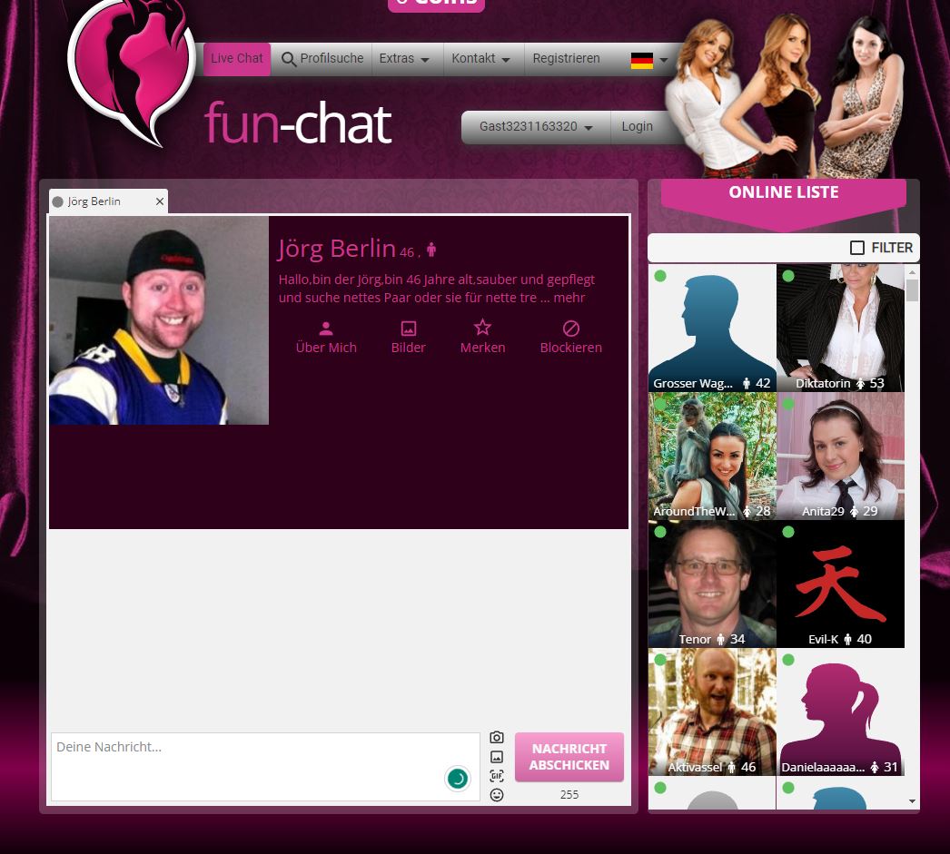 Fun-Chat.com ist für dich geeignet, wenn du nach erotischen Treffen suchst, falls es dir ausreicht nur zu chatten ohne Cam Sex. Es sind viele User im Sex Chat von Fun-Chat aktiv, die Profile kann man sich kostenlosen ansehen.