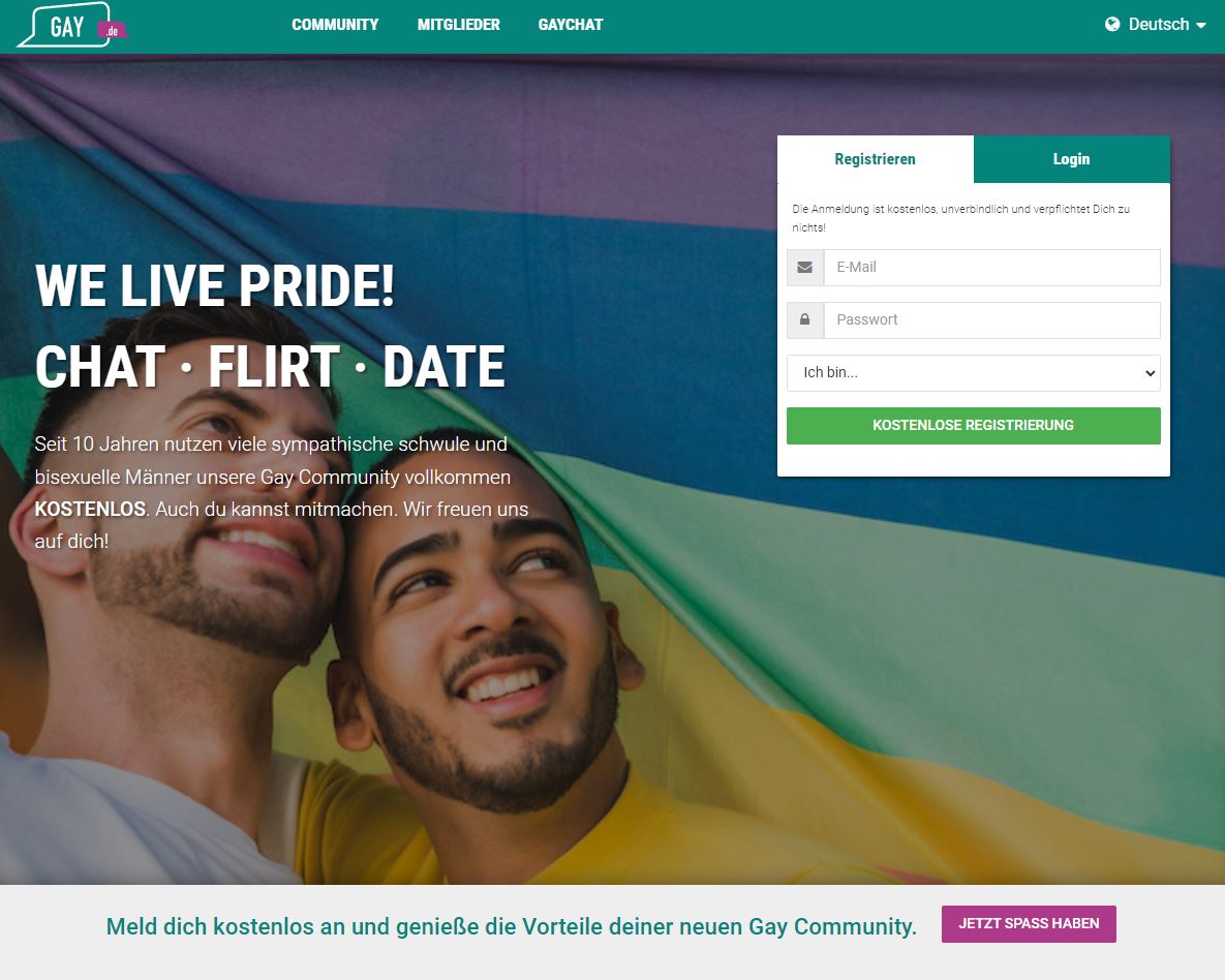 Das Dating Portal Gay.de ist die Nummer 1, wenn es um Schwulen Sex geht. Hier bei Gay.de findest du tausende Deutsche Männer die auf der Suche nach einem Mann sind. Der Sex Chat ist sehr gut, man findet schnell Anschluss und an sich kann man hier nichts falsch machen. Eine sehr übersichtliche Seite, mit einer starken Community für Schwule. Auch als Hetero Mann, mit Gay Fantasien ist hier das Angebot sehr groß. Flirt, Date und chatte mit Deutschland schwulsten Boys. Die Suche ermöglicht es dir, Gay Sexkontakte aus deiner Nähe zu finden. Bereit für dein erstes Mal mit einem Mann?
